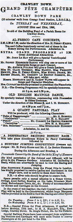 To attract the right sort of visitor, an advertisement informed the readers that there would be “plenty of accommodation for horses and carriages on the ground”. Also, special railway fares had been arranged from neighbouring stations, with carriages meeting most trains at the station in Crawley Down to convey passengers to the fete at 6d per head.
